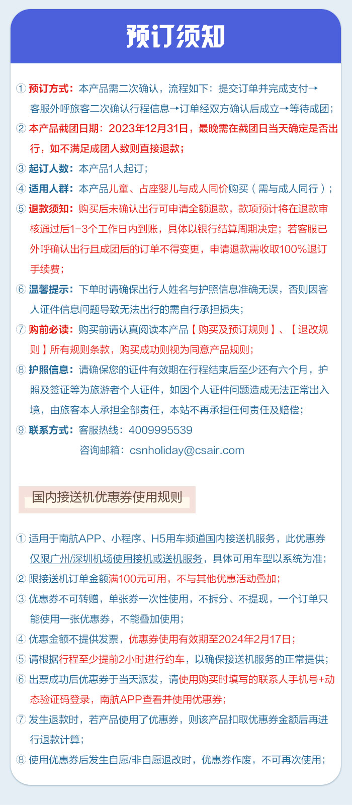 ⑨联系电话:客服热线4009995539;客服邮箱csnholiday@csair.com
