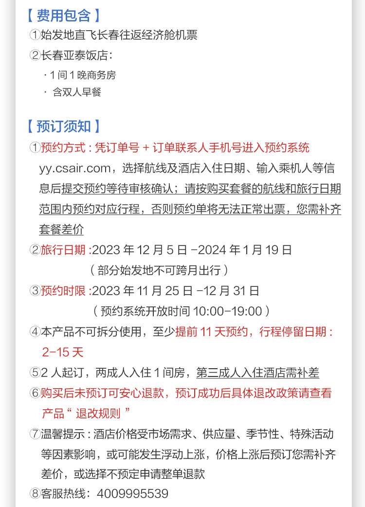 10.如对本产品有任何疑问,请咨询客服4009995539或发邮至csnholiday@csair.com。