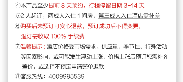 2. 本产品2人起订,2成人入住一间房,至少提前8天预约(需在预约时限内),预订结果以预订成功短信为准。舱位/酒店房间数量有限,先订先得,不接受指定航班日期及酒店入住日期。