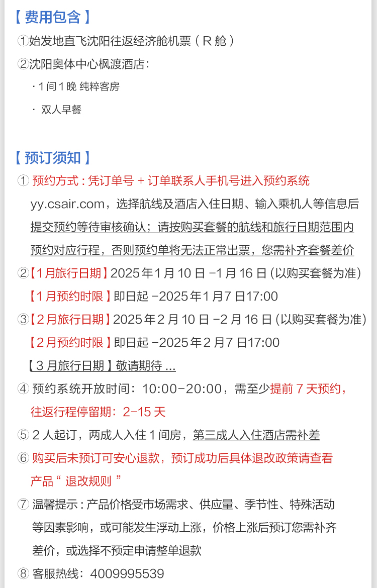 【旅行日期范围】2025年1月10日-1月16日、2月10日-2月16日(具体以购买套餐为准,不可跨时间段出行); 【预约时限】即日起-2025年2月7日(10:00-20:00),在预约时限内至少提前7天出票,未预约可退