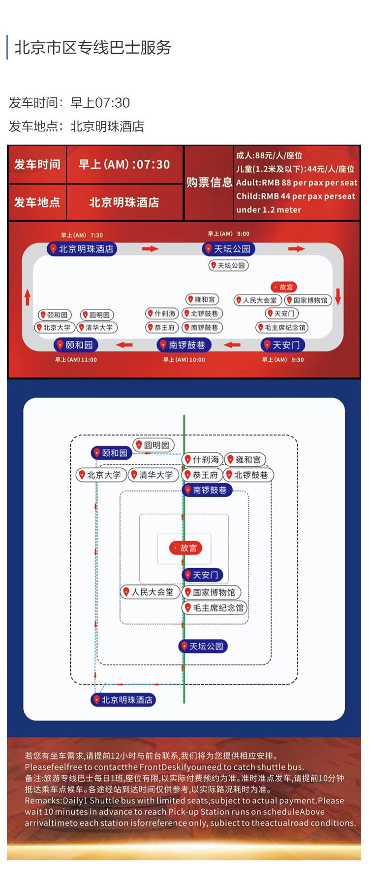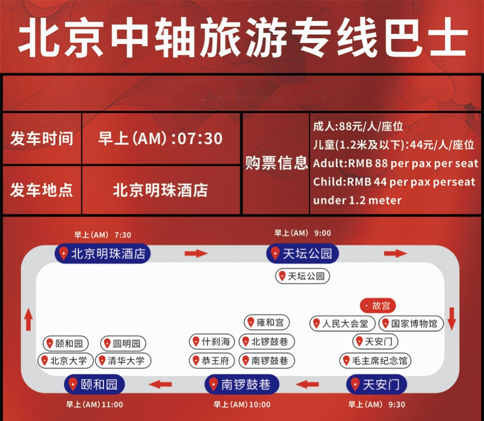 【北京中轴线套餐】北京明珠酒店1晚含市区中轴线巴士