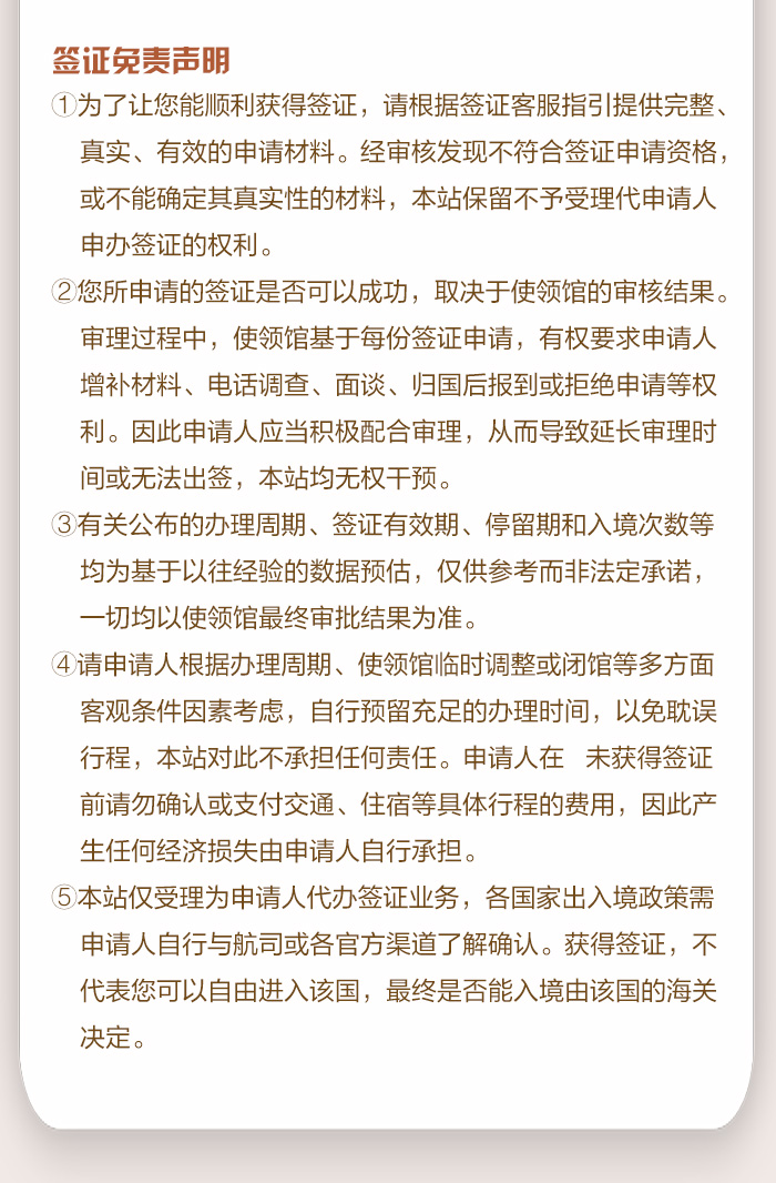 5. 若因您自身资料问题导致使馆延时出签的,本公司不承担任何责任。