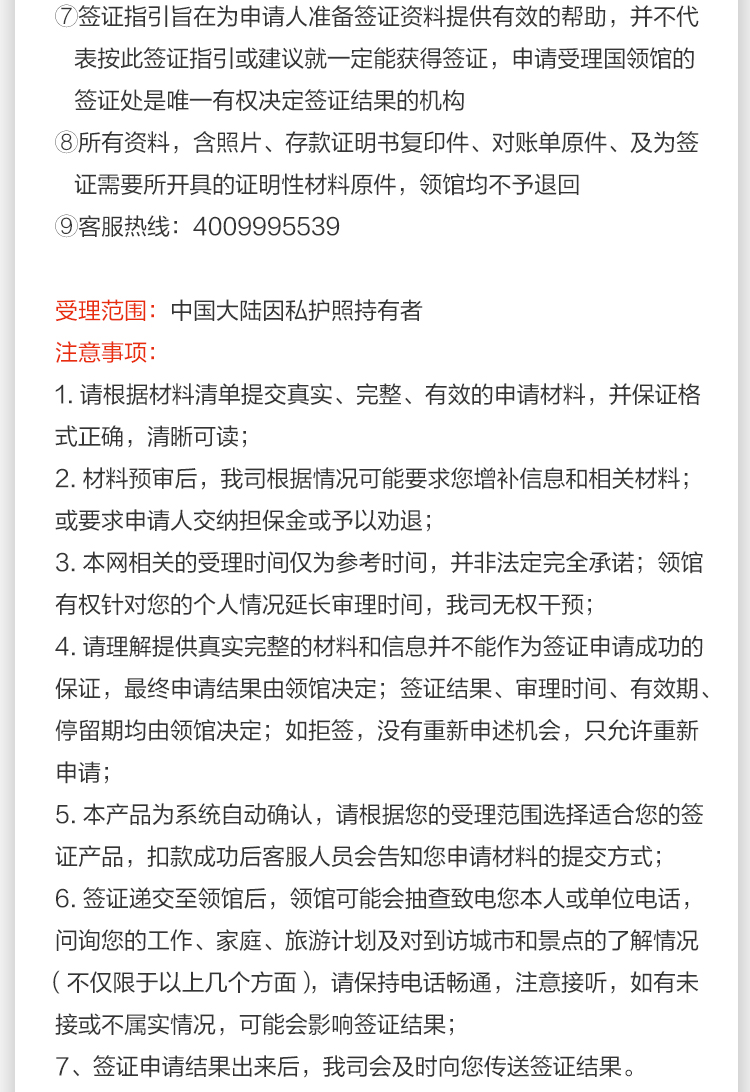 8. 是否出签由各国领事馆或签证中心决定,如被拒签,费用不退还。