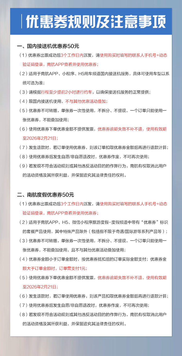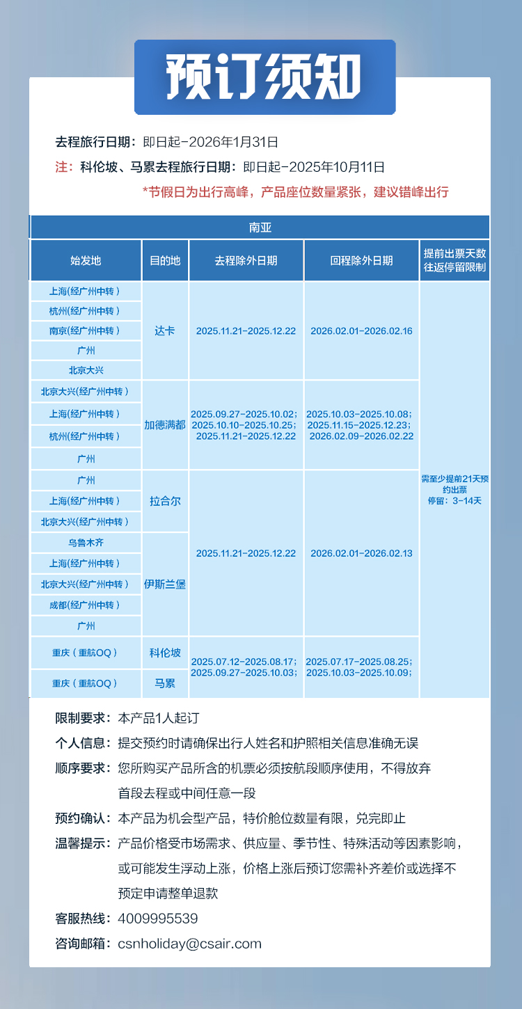 7. 如对本产品有任何疑问,请咨询客服4009995539或发邮至csnholiday@csair.com。
