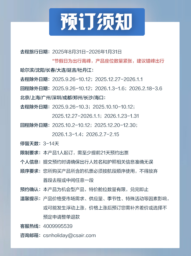 7. 如对本产品有任何疑问,请咨询客服4009995539或发邮至csnholiday@csair.com。