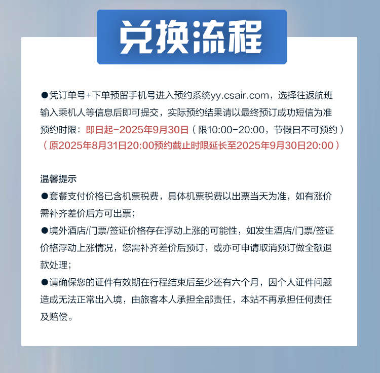 7. 如对本产品有任何疑问,请咨询客服4009995539或发邮至csnholiday@csair.com。