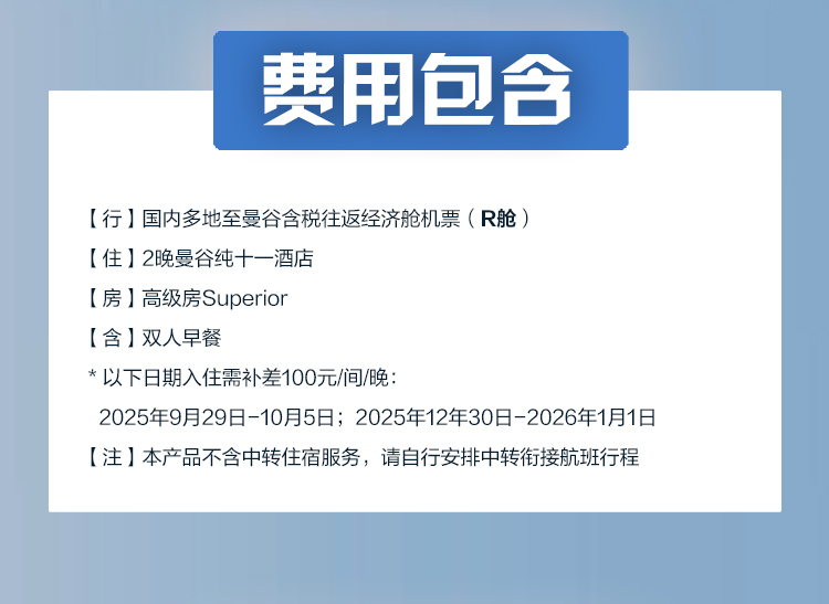 3. 本产品不含中转住宿服务,请自行安排中转衔接航班行程。