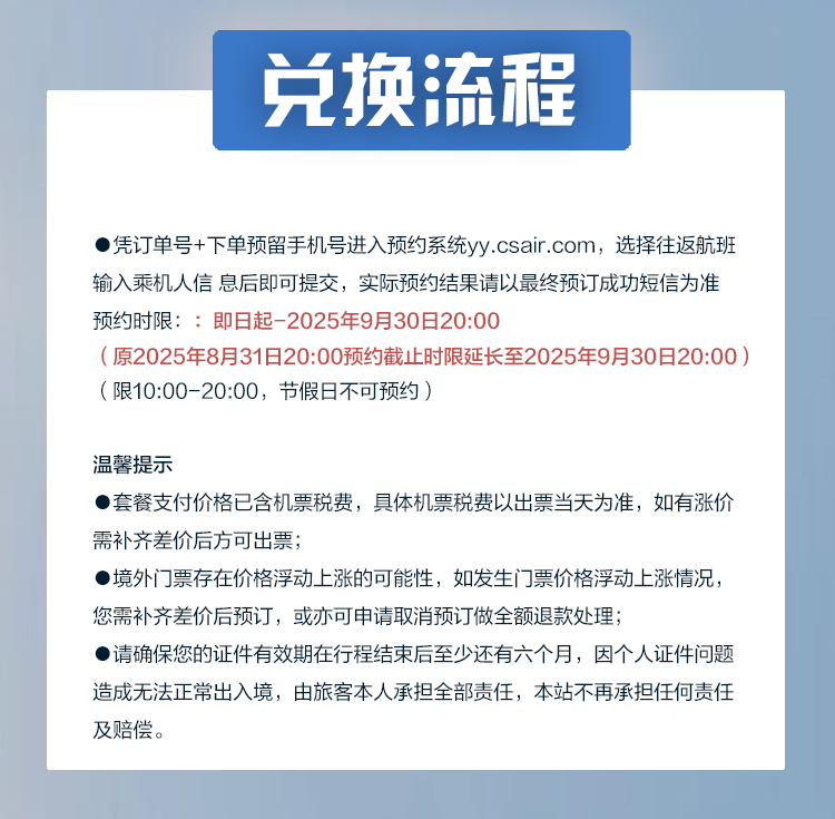 8. 如对本产品有任何疑问,请咨询客服4009995539或发邮至csnholiday@csair.com。