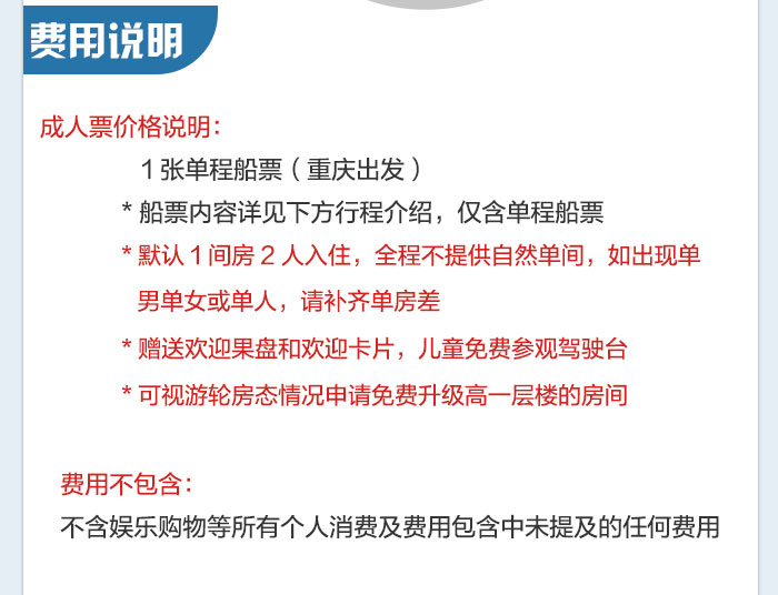 1. 欢迎您坐长航游轮,本产品可视游轮房态情况申请免费升级高一层楼的房间,赠送欢迎果盘和欢迎卡片,儿童免费参观驾驶台。