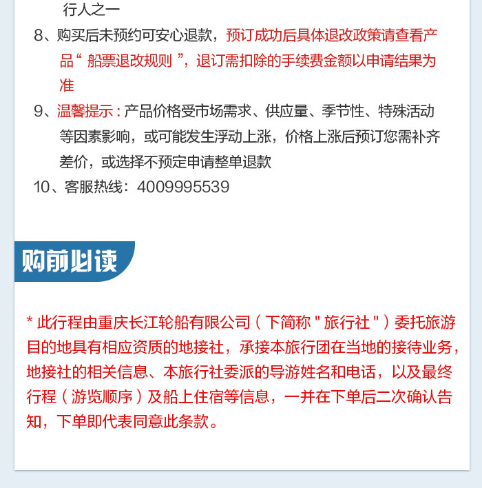一、本产品未预约可申请全额退款,本产品不可转让;如轮船因受市场需求、供应量、季节性、特殊活动等因素影响无法出行,可以与我司协商改期