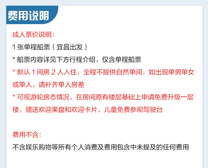 1. 欢迎您坐长航游轮,本产品可视游轮房态情况申请免费升级一楼层,赠送欢迎果盘和欢迎卡片,儿童免费参观驾驶台。