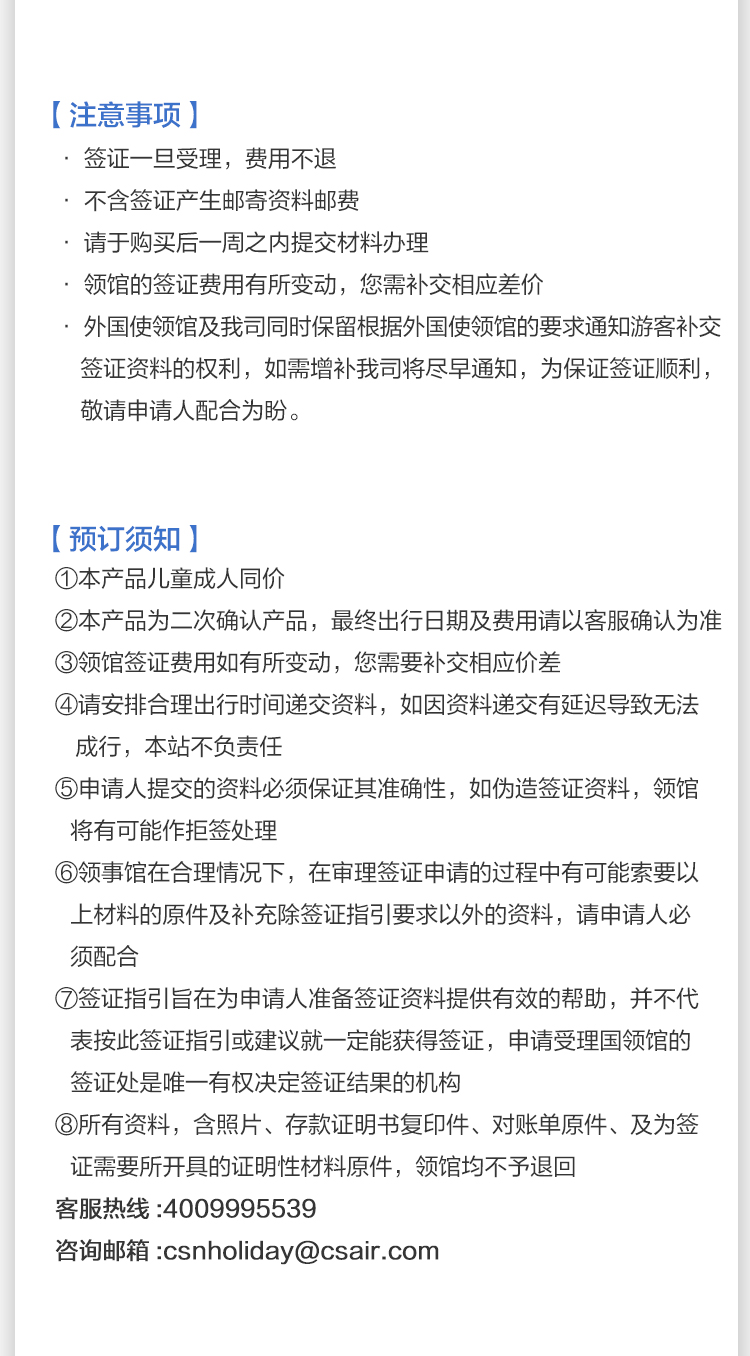 9. 签证费上涨说明:旅客下单后需及时将相关资料提交办理,否则如遇政策原因(如领事馆调价)的价格上涨,旅客需补齐差价。