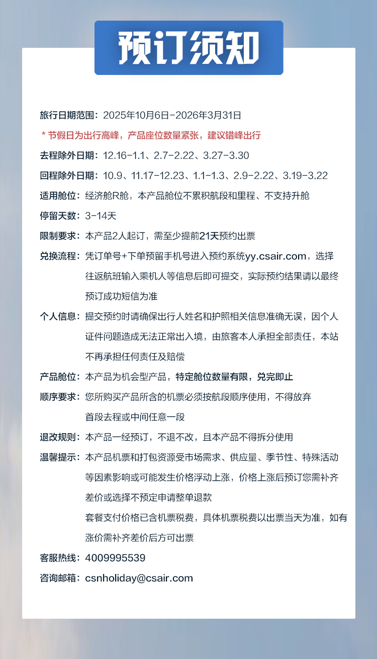 8. 如对本产品有任何疑问,请咨询客服4009995539或发邮至csnholiday@csair.com。