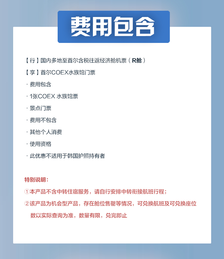 【与世界相遇-秋冬】国内多地至首尔3-14天自由行(往返含税经济舱机票+1张COEX水族馆门票)