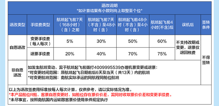 5. 机票必须按顺序使用(去程未用,回程也不能用),否则南航有权取消后续行程的机位, 由此可能发生的费用增加由您自行承担。