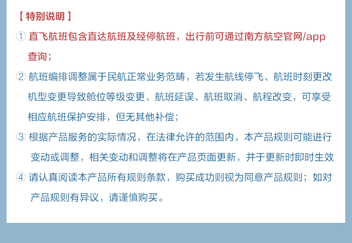 3、购买前请注意机票去回程退改签规则,最终以南航规定为准,国际往返机票单段使用后不得退票,多程联运不得跳段使用。