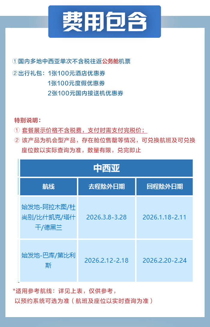【臻享全球】国内至中西亚单次往返公务舱机票套餐(享400元出行礼包)