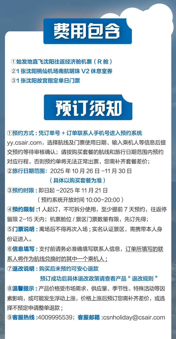 10. 如对本产品有任何疑问,请咨询客服4009995539或发邮至csnholiday@csair.com。