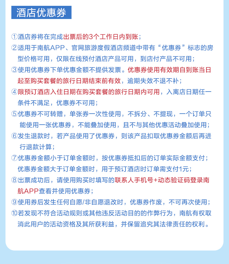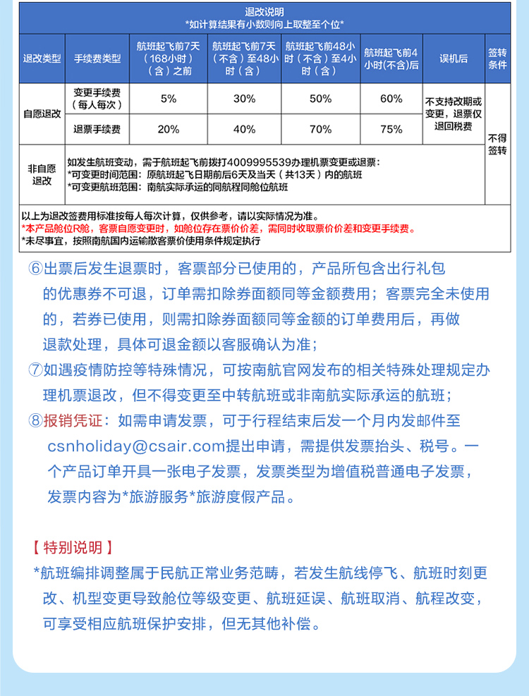 5. 机票必须按顺序使用(去程未用,回程也不能用),否则南航有权取消后续行程的机位, 由此可能发生的费用增加由您自行承担。