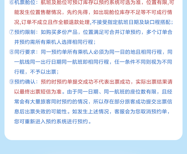 4. 请您在购买产品时填写正确的旅客信息及联系信息,如因您提供的信息有误,导致客票不能成行或无法接收航班变动信息等情况,本站不承担任何责任。