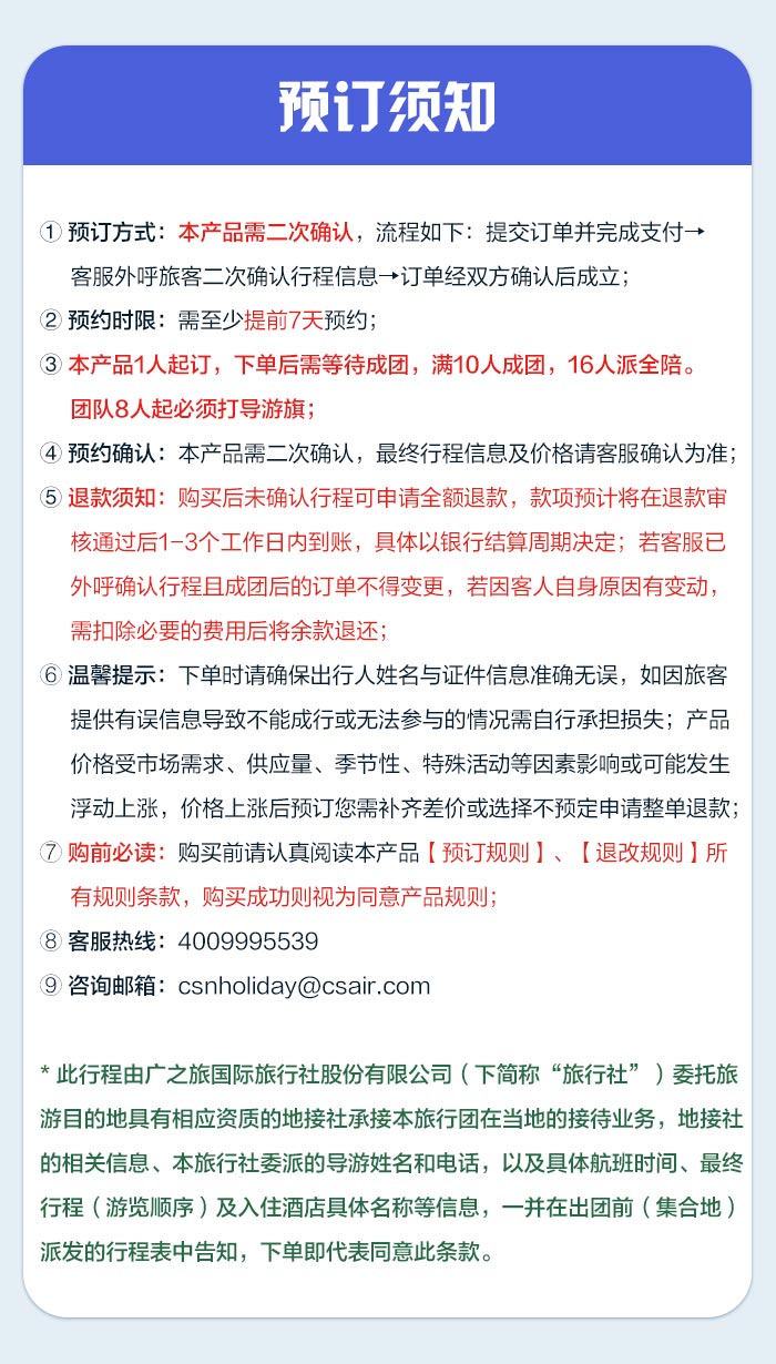 南航旅行网的旅游产品由南航及南航指定合作旅行社提供。 在预订开始前,请仔细阅读本须知,产品页面中的产品备注也作为协议的补充内容。当您开始预订旅行产品时,已表明您仔细阅读并接受协议的所有条款。