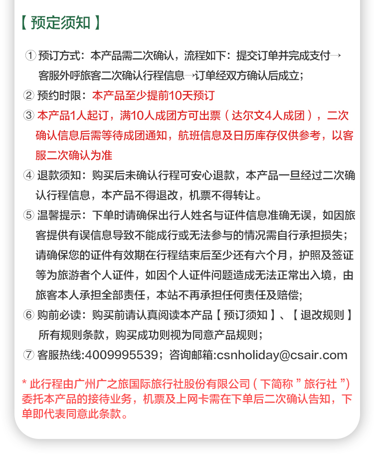 2.本产品1人起订,满10人成团方可出票(达尔文4人成团),下单后需等待成团通知。预订结果以预订成功短信为准。舱位数量有限,先订先得,不接受指定航班日期。