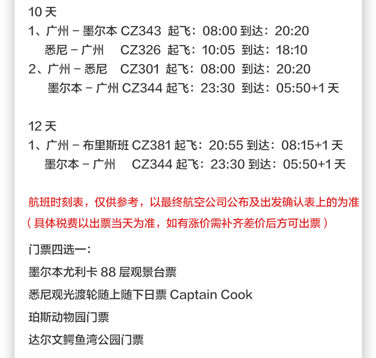 【澳洲自由行】广州直飞澳大利亚6-12天自由行(含税机票+墨尔本尤利卡88层观景台票或悉尼观光渡轮随上随下日票CaptainCook或珀斯动物园门票或达尔文鳄鱼湾公园门票四选一)