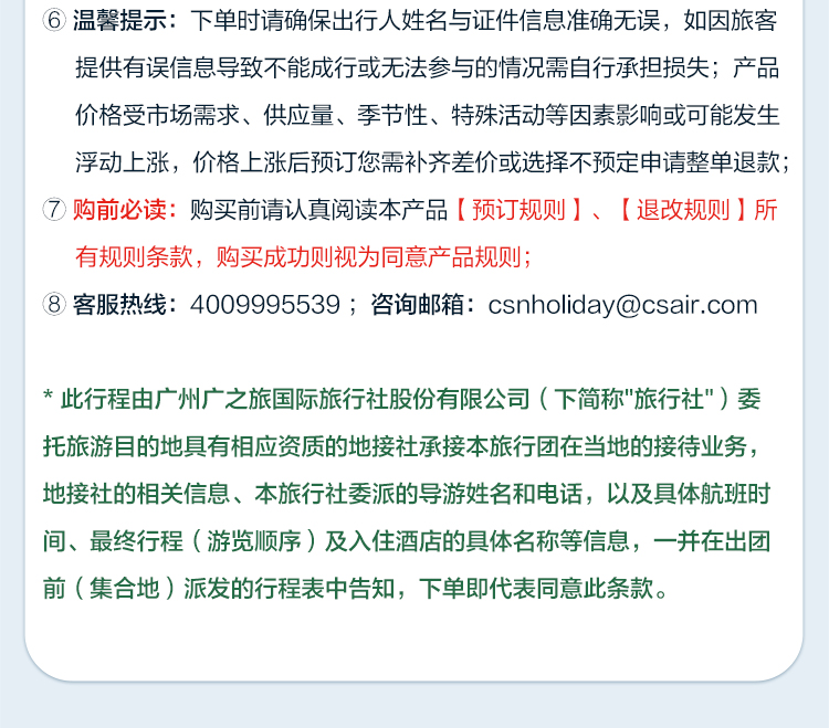 4.旅行社可以根据实际情况,在保证行程景点游览不变且经与客人协商一致的前提下,对景点的游览顺序作合理的调整,下单即代表同意此条款。