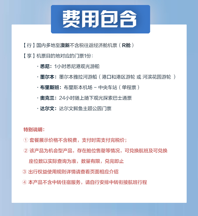 4. 本产品支付价格已含机建燃油税,受国际航空油价、燃油附加费等政策影响,购买后出票时如发生燃油费上涨需补齐差价。