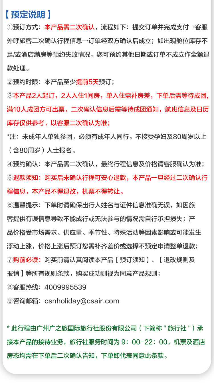 10.如对本产品有任何疑问,请咨询客服4009995539或发邮至csnholiday@csair.com。