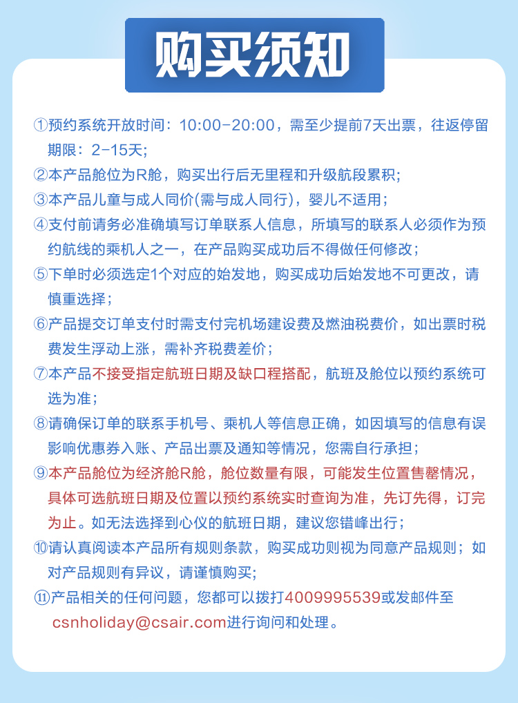 3、购买前请注意机票去回程退改签规则,最终以南航规定为准,国际往返机票单段使用后不得退票,多程联运不得跳段使用。