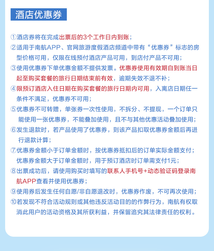 5. 机票必须按顺序使用(去程未用,回程也不能用),否则南航有权取消后续行程的机位, 由此可能发生的费用增加由您自行承担。