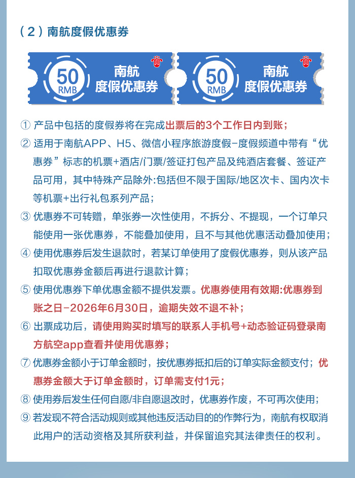 5. 机票必须按顺序使用(去程未用,回程也不能用),否则南航有权取消后续行程的机位, 由此可能发生的费用增加由您自行承担。
