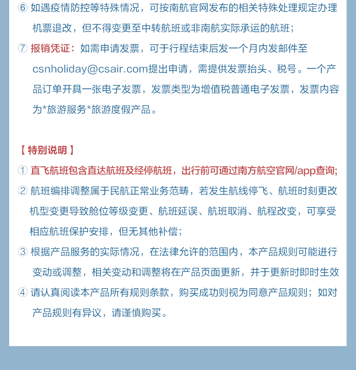 3、购买前请注意机票去回程退改签规则,最终以南航规定为准,国际往返机票单段使用后不得退票,多程联运不得跳段使用。