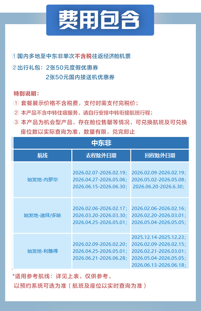 【畅游中东非】国内多地至中东非单次往返经济舱机票(享200元出行礼包)