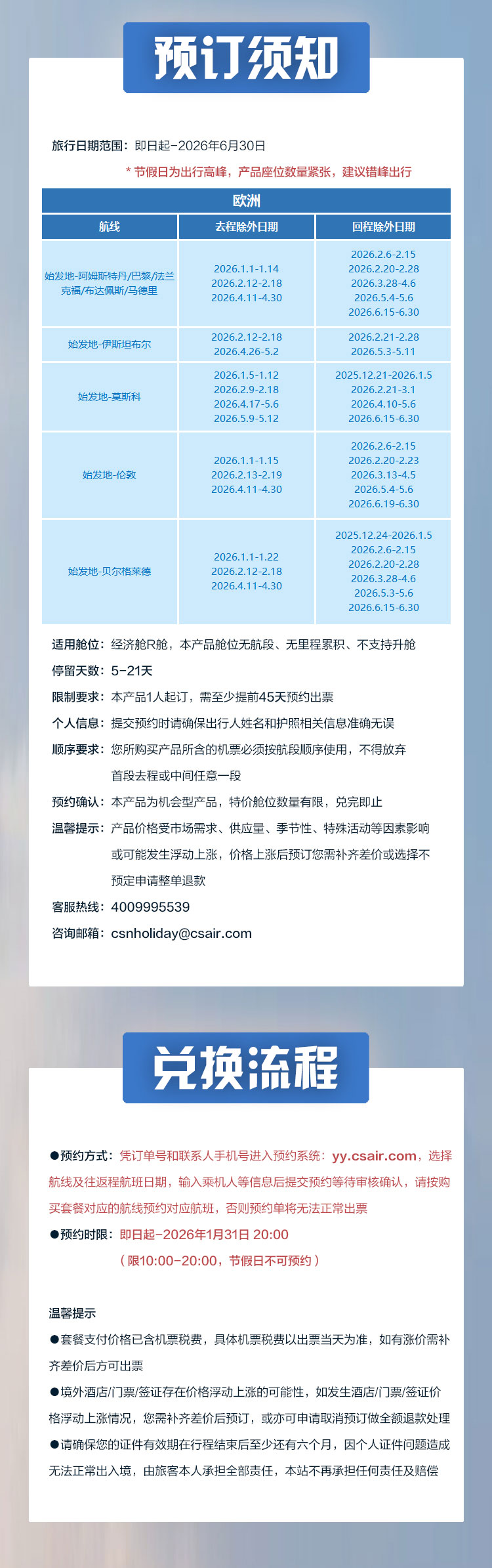 7. 如对本产品有任何疑问,请咨询客服4009995539或发邮至csnholiday@csair.com。