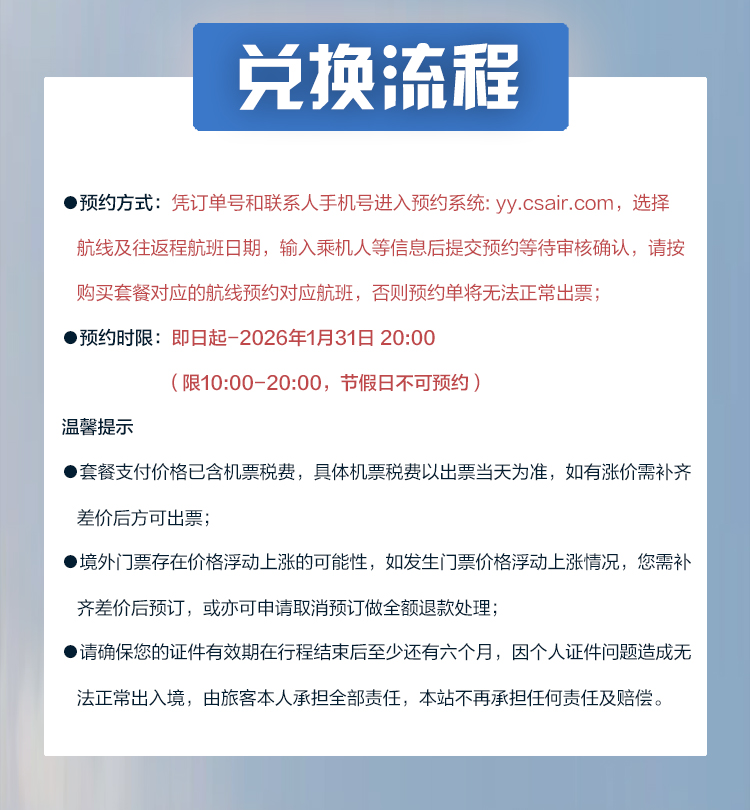 1)本产品需预约,预订流程如下:提交订单—>完成支付—>凭订单号+下单预留手机号进入预约系统yy.csair.com(点击跳转) —>如出现特价舱位库存不足等不可成行情况,订单不成立且作全额退款处理。