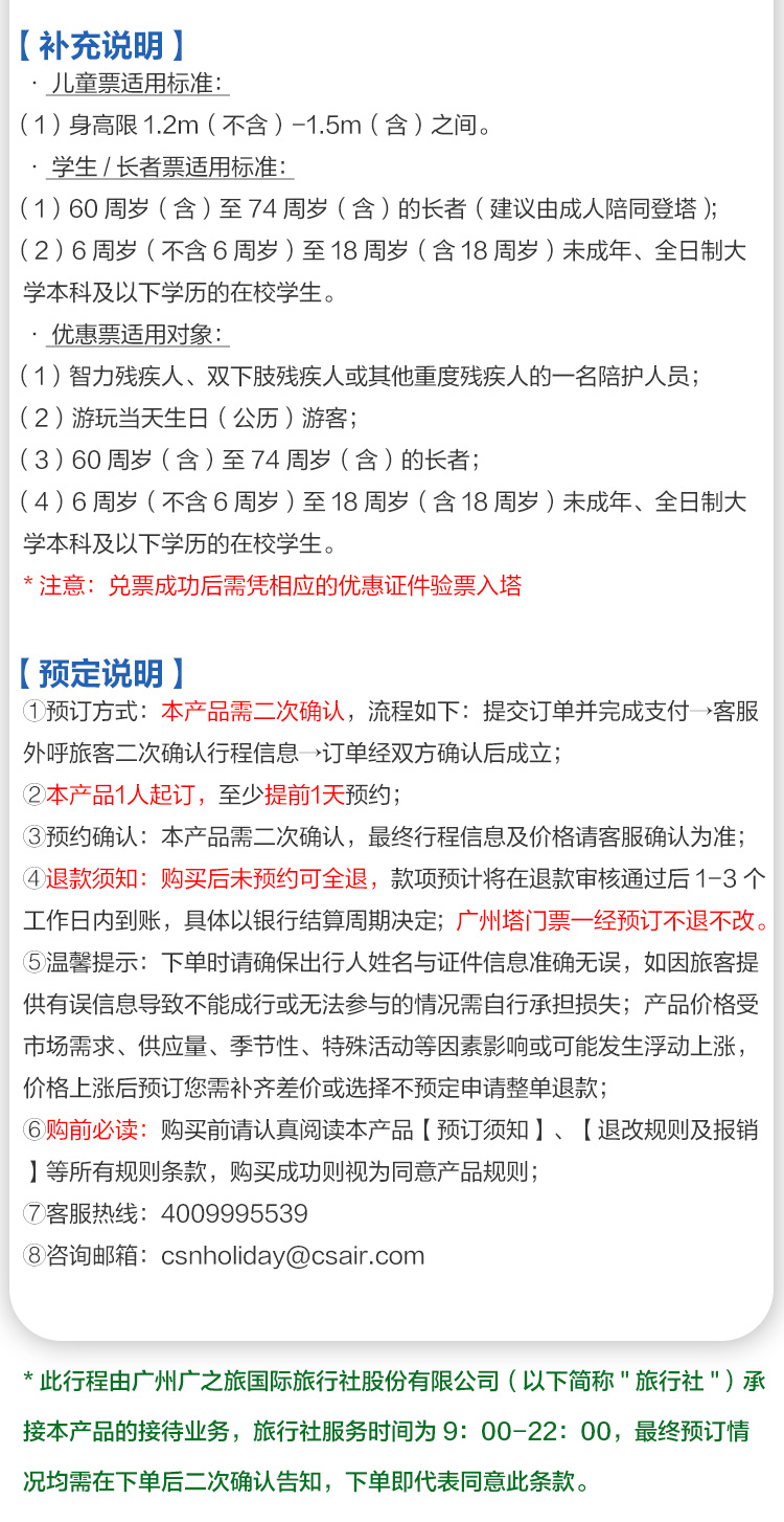 6、温馨提示:如遇突然恶劣天气或机械故障和其他特殊情况而暂停的开放,请客人不要兑换门票并及时联系客服改期或退款,如已兑换门票,请即场咨询广州塔人员退改门票手续并联系广之旅处理。儿童票,儿童免票,老人免票需要客人自行咨询景区。