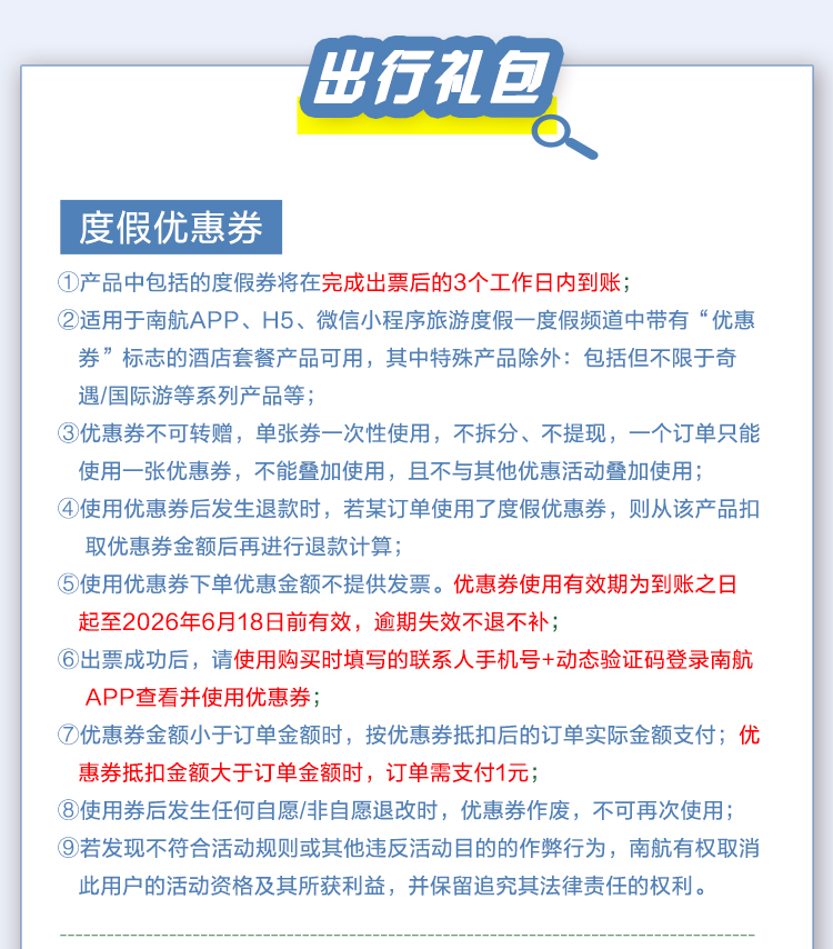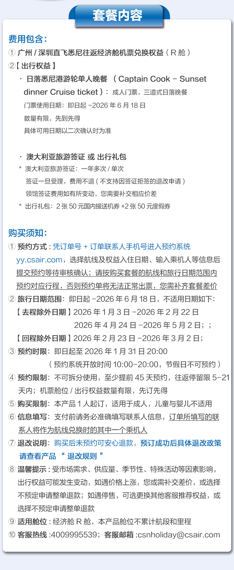 6. 如对本产品有任何疑问,请咨询客服4009995539或发邮至csnholiday@csair.com。