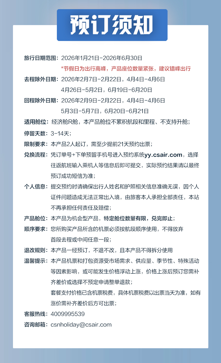 8. 如对本产品有任何疑问,请咨询客服4009995539或发邮至csnholiday@csair.com。