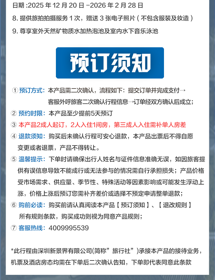 2. 本产品2人起订,至少提前5天预订,预订结果以预订成功短信为准。舱位/酒店房间数量有限,先订先得,不接受指定航班日期及酒店入住日期。