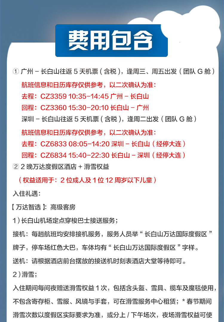【长白山自由行】广州/深圳-长白山5天4晚自由行(往返机票+2晚万达度假区酒店+滑雪权益)