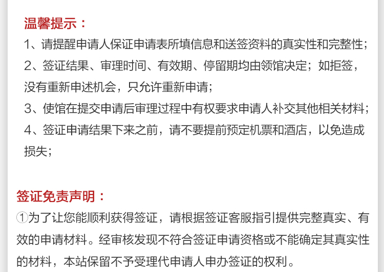 5. 请及时向客服确认出行日期,签证的有效期是从资料齐全进入使馆后开始起算,建议申请人离出行前30天办理签证(电子签建议提前5天)以便确认申请办理签证。