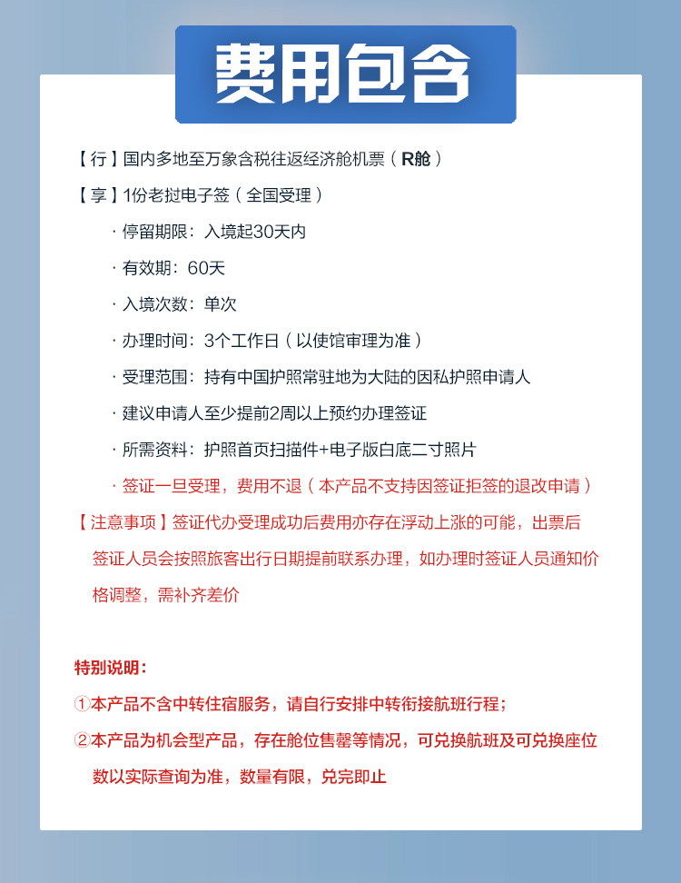4. 本产品支付价格已含机建燃油税,受国际航空油价、燃油附加费等政策影响,购买后出票时如发生燃油费上涨需补齐差价。