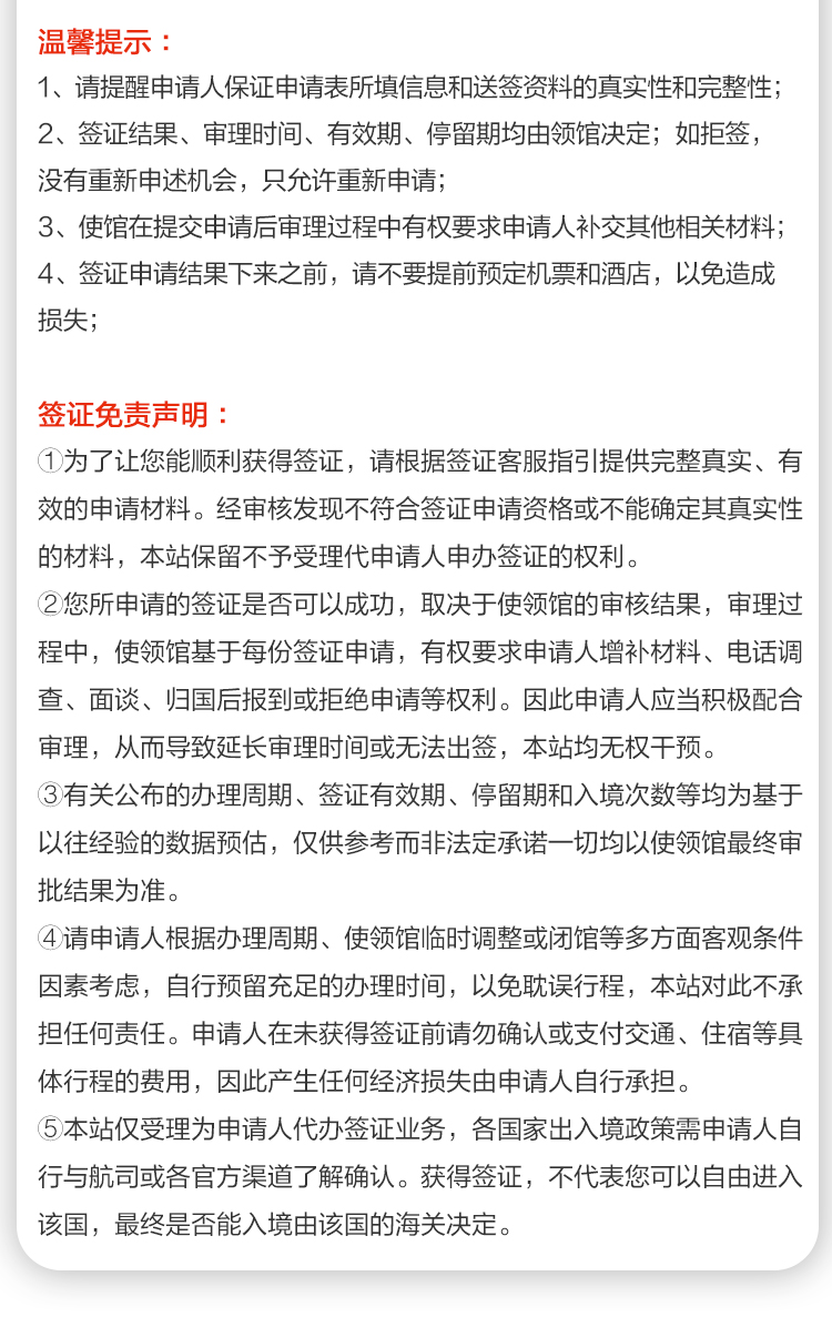 5. 若因您自身资料问题导致使馆延时出签的,本公司不承担任何责任。