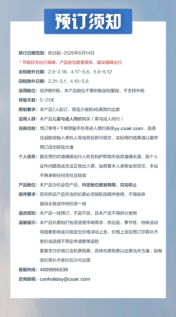 8. 如对本产品有任何疑问,请咨询客服4009995539或发邮至csnholiday@csair.com。