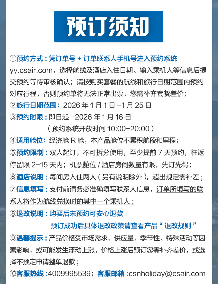 11.如对本产品有任何疑问,请咨询客服4009995539或发邮至csnholiday@csair.com。