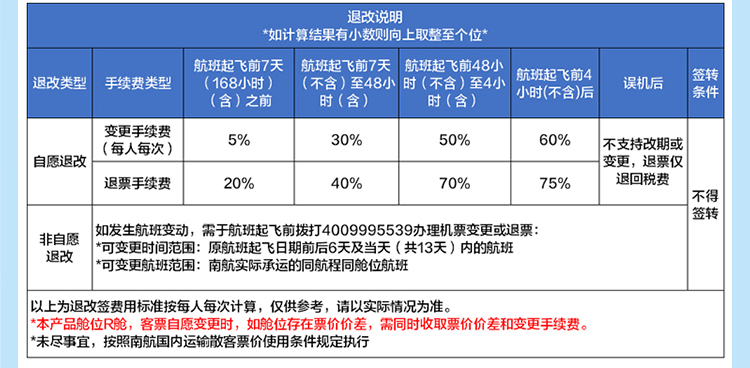 5. 机票必须按顺序使用(去程未用,回程也不能用),否则南航有权取消后续行程的机位, 由此可能发生的费用增加由您自行承担。