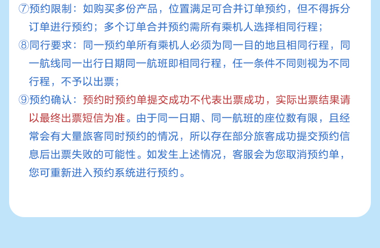 4. 请您在购买产品时填写正确的旅客信息及联系信息,如因您提供的信息有误,导致客票不能成行或无法接收航班变动信息等情况,本站不承担任何责任。