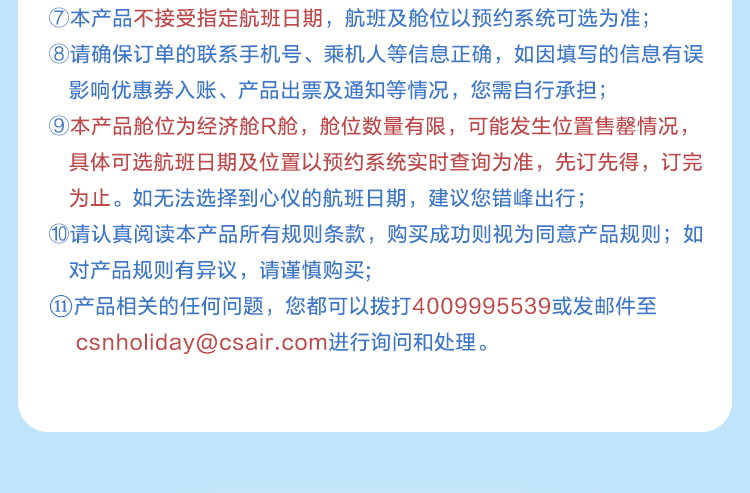 3、购买前请注意机票去回程退改签规则,最终以南航规定为准,国际往返机票单段使用后不得退票,多程联运不得跳段使用。